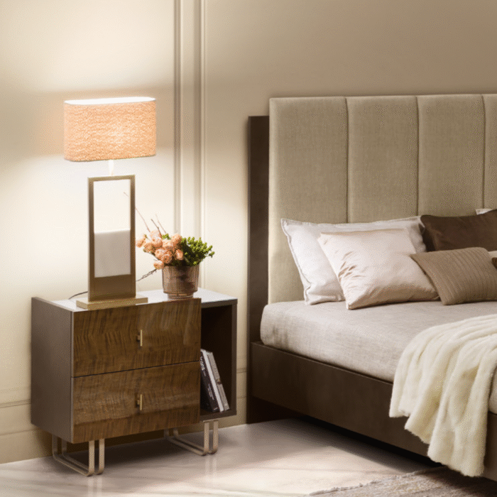 The side compartment, designed to hold books and small everyday objects, introduces a dynamic and functional element, giving the bedside table a practicality that perfectly reflects a contemporary living style.