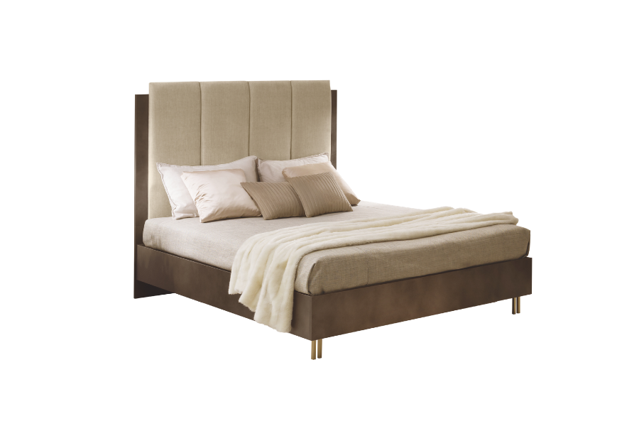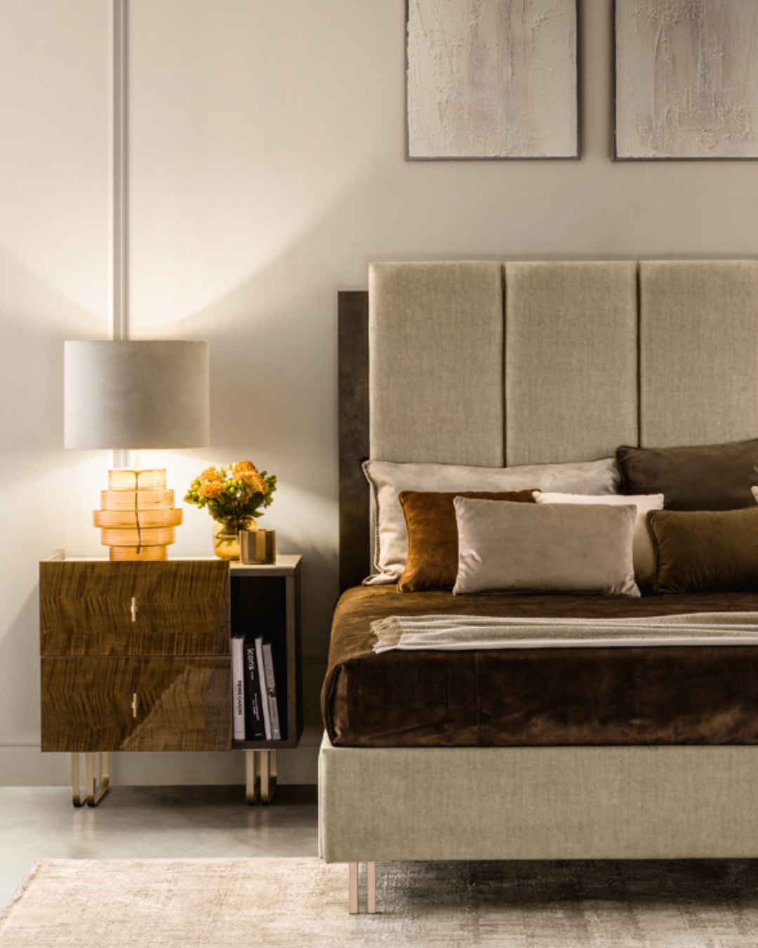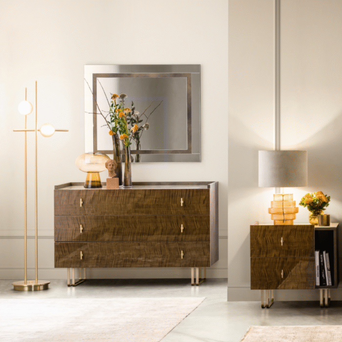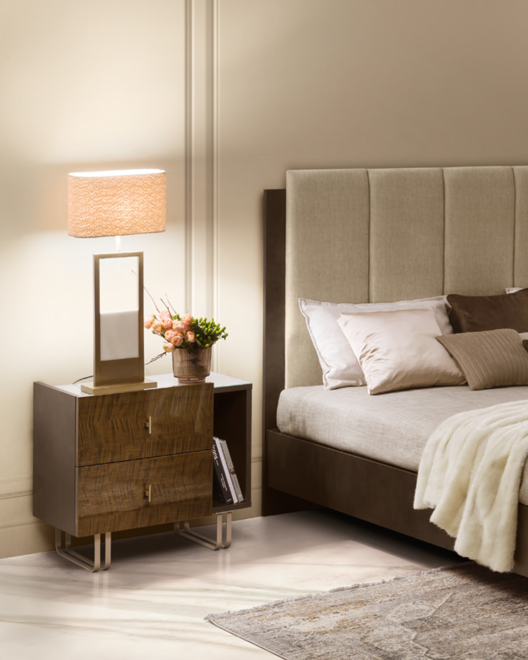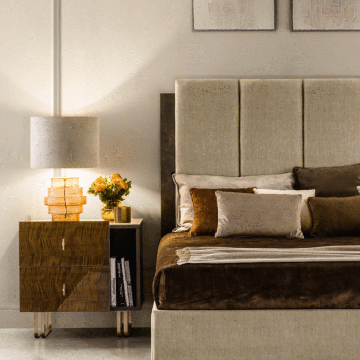 The Fiamma bedside tables faithfully echo the material and chromatic choices of the bedroom area, as well as the collection’s distinctive tray-shaped top.