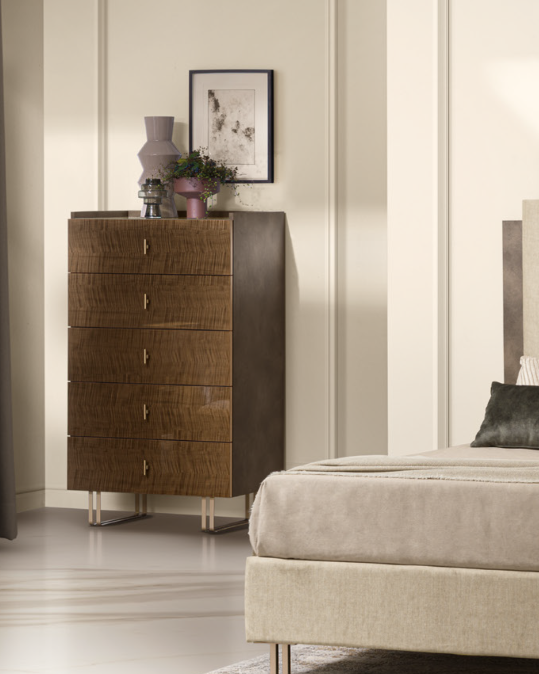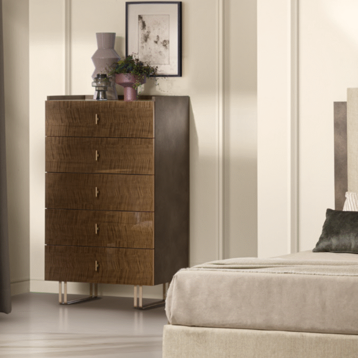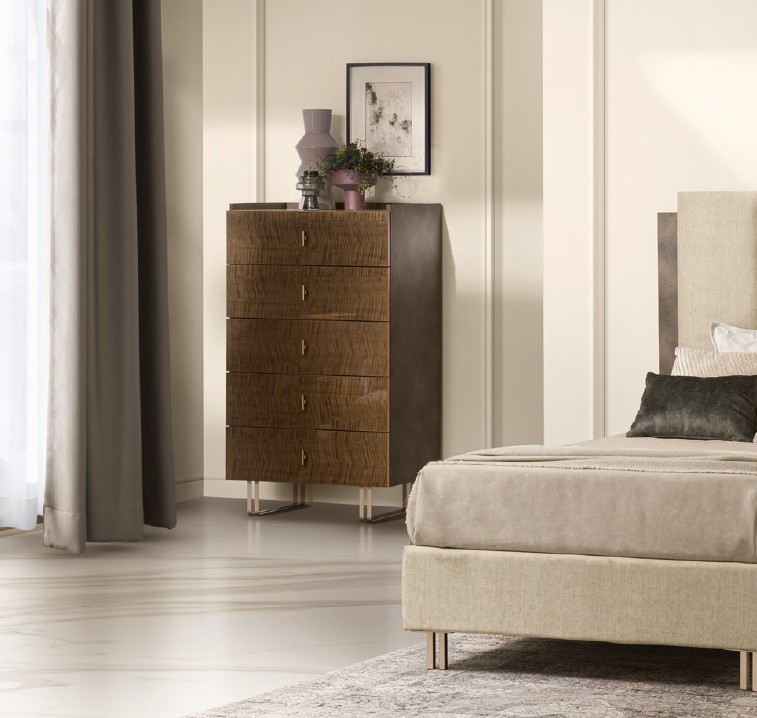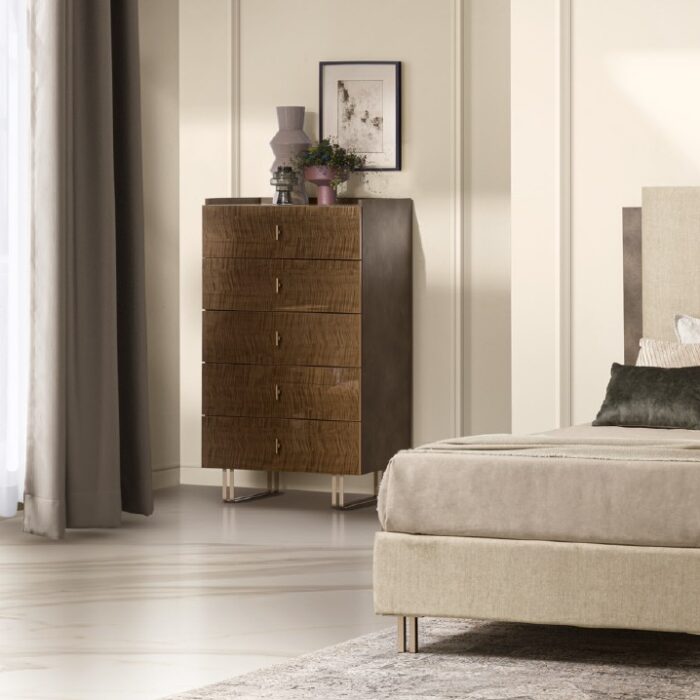 The tallchest is a refined furnishing element that brings order and adds extra storage capacity to the bedroom area. The Fiamma version consistently reflects the formal and material language of the collection.