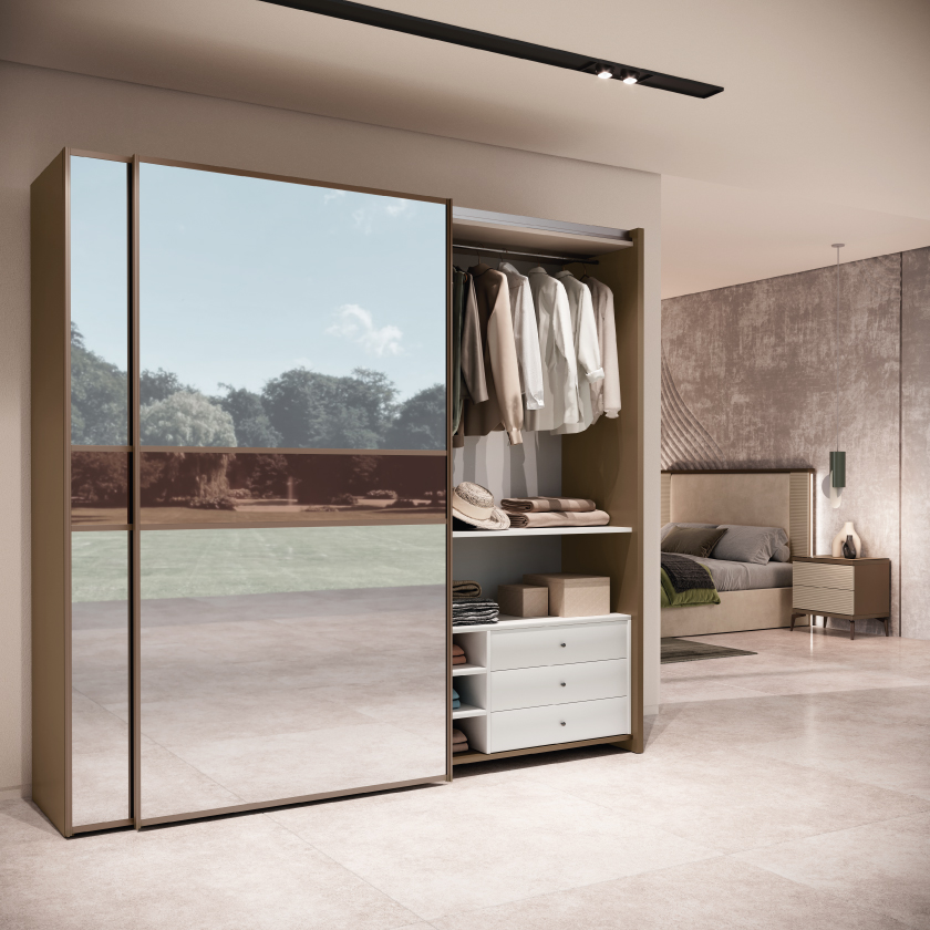 The two-door sliding version is also available with a central bronze insert, echoing the profiles and adding a touch of sophisticated refinement. The 4-door wardrobe is ideal for smaller spaces, while the 6-door model offers greater capacity, perfect for master bedrooms and suites.