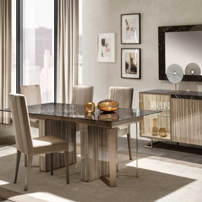The contrast between the dark grain of the top and the super bright underside is remarkable and composed of satin champagne-colored side legs and two elegant central blocks that echo the Zebrano-effect wood finish in the warm neutral shade that characterizes the entire collection.